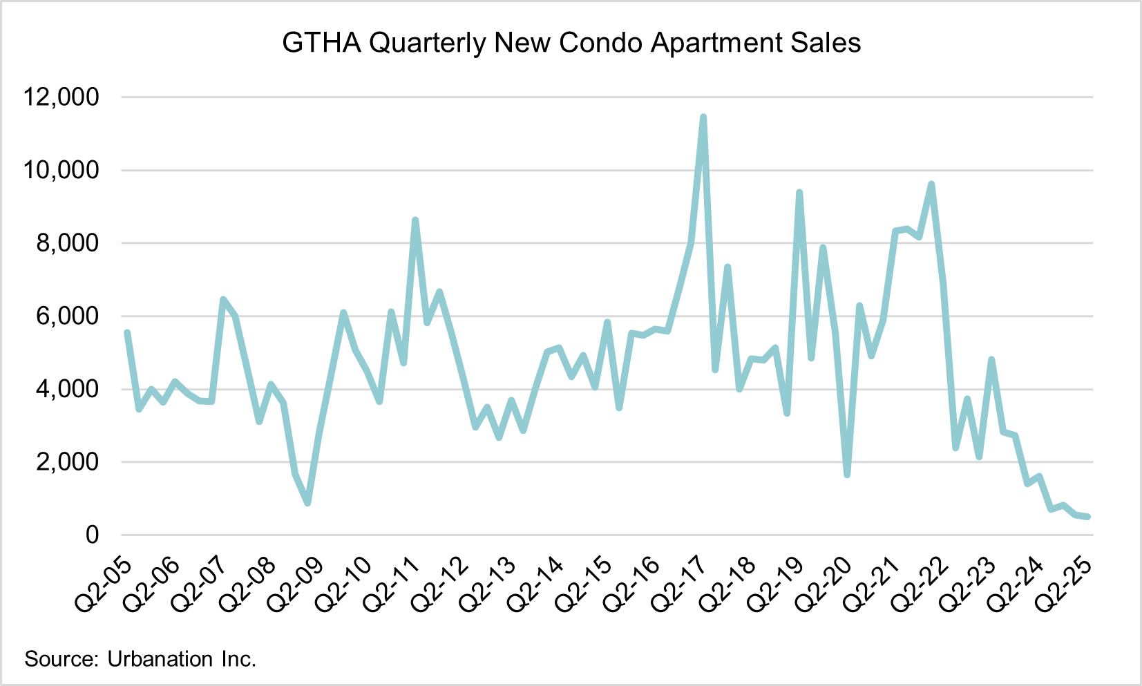 The Greater Toronto Hamilton Area (GTHA) new condominium apartment market produced 502 sales in Q2-2025, continuing to break 30-year lows by declining 10% from Q1-2025 and dropping 69% year-over-year. While Q2 normally represents the strongest period of the year for new condo sales, activity this year was 91% below the 10-year average.