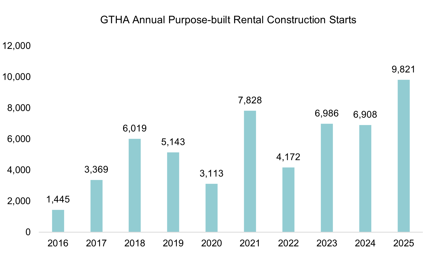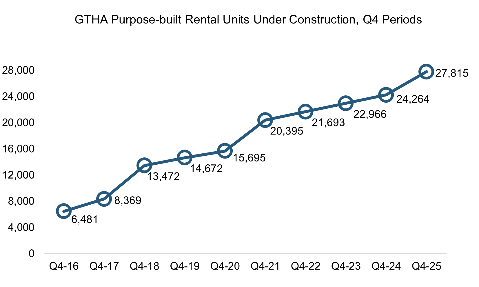 A total of 9,821 purpose-built rental units started construction in 2025, a 42% increase over the 6,908 units that started construction in 2024 and representing the highest annual total since the 1970s. As of year-end 2025, a total of 27,815 purpose-built rental units were under construction in the GTHA, rising 77% over the past five years.